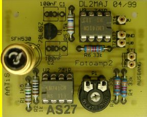 | Die kleine Schaltung rund um den UV/B-Sensor SFH530 liefert eine der UV-Strahlung proportionale Spannung im Bereich 0...5V, optimal für die AATiS-Wetterstation AS053 geeignet! Platine 40x50 mm.