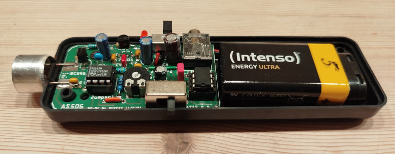Nachfolger von AS520. Als Peilgerät für BatOring und zur akustischen Beobachtung von Fledermäusen einsetzbar. Anschluss für handelsüblichen Kopfhörer an 3,5 mm Stereo-Klinkenbuchse. Fast verdrahtungsfreier Aufbau und kompaktes Gehäuse. Passt bequem in jede Hemd-, Hosen- und Rucksacktasche. Ideal für „Aufsteiger“. Hinweise zum Aufbau/Gehäusebearbeitung (Öffnung für Schalter, LED und Sensor sind zu erstellen) siehe AATiS-Hompage.
