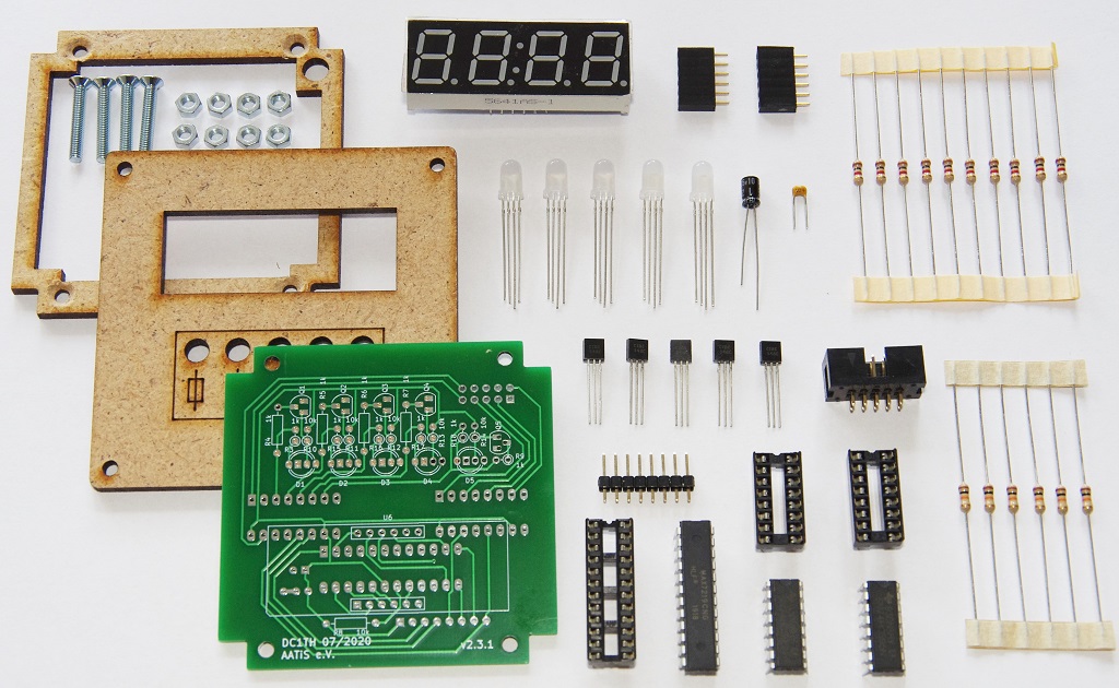 Ab Version v2.3.0 (Hardware) hat der Timer eine andere Ansteuerung für die 7-Segment-Anzeige und rot-grüne Leds für die Sicherungen (statt ausschließlich grün). Der Aufbau des Timer-Outputs hat sich dadurch etwas geändert: Bei diesen mehrfarbigen LEDs wird - anders als bei den einfarbigen LEDs - das lange Beinchen in das viereckige Lötpad gesteckt. Weiterhin sind ein paar Transistoren und Widerstände dazu gekommen und die ICs werden jetzt auf der Unterseite bestückt. Manche der Widerstände werden senkrecht eingebaut, das heißt eines der beiden Beinchen wird um 180° umgebogen, das andere gar nicht. Der Widerstand wird dann aufrecht eingelötet. Außerdem wird die 7-Segment-Anzeige direkt in Sockelleisten auf der Hauptplatine gesteckt und ist nicht mehr auf einer Extra-Platine. Die Inter-PCB-Verbindung zwischen Timer und Timer-Output hat jetzt 8 statt 7 Leitungen.
