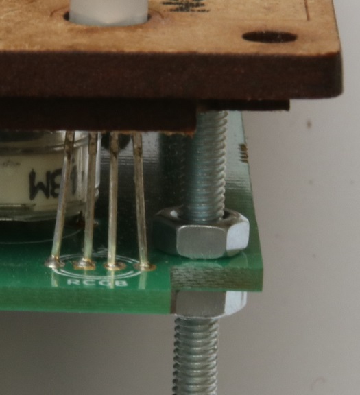 | Mit vier zusätzlichen Muttern kann der Abstand zwischen Platine und Frontplatte reguliert werden. |